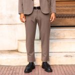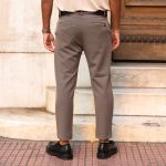 Καφέ κομψό παντελόνι με κανονική εφαρμογή. Κουμπί και φερμουάρ στον καβάλο. Λοξές πλαϊνές τσέπες και τσέπη φιλέτο στο πίσω μέρος. Σύνθεση: 70% viscose – 25% pol – 5% sp Ελληνικής κατασκευής. Το μοντέλο έχει ύψος 1,80 και φοράει Μ
