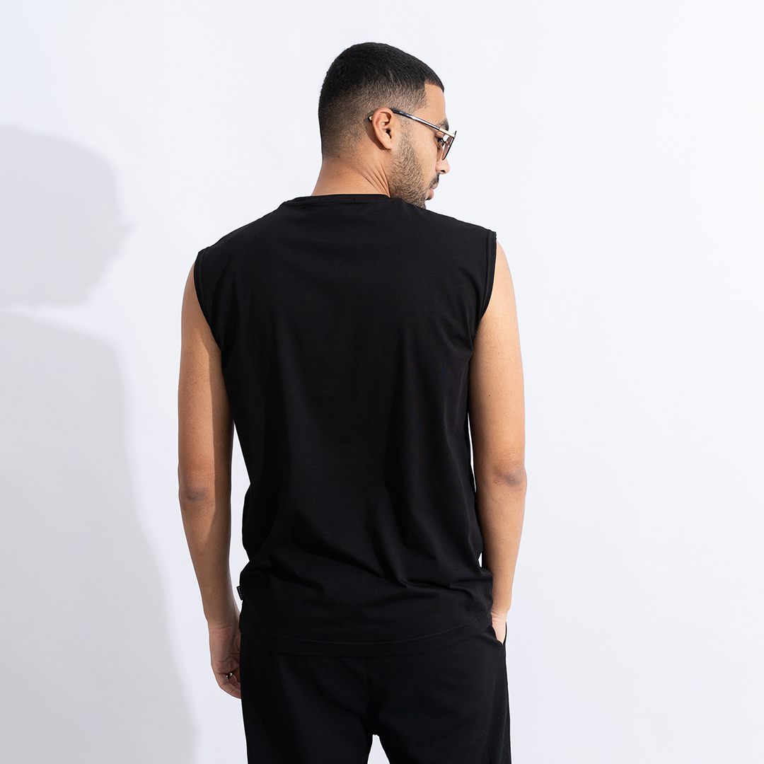 Άνετο αμάνικο μπλουζάκι μαύρο από βαμβακερό ύφασμα. Λεπτομέρεια με υφαντό στο τελείωμα. Σύνθεση: 100% cotton. Ελληνικής κατασκευής. Το μοντέλο έχει ύψος 1,80 και φοράει M